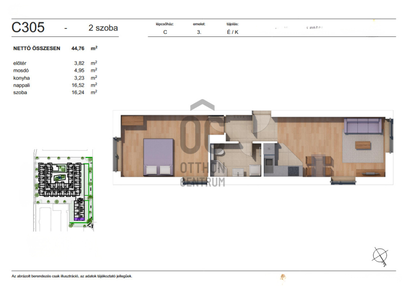 - széles körű lakáskínálat: a modern kialakítású lakások nappali+1 szobás, illetve nappali+2 szobás elrendezésben érhetők el. Néhány földszinti lakás kertkapcsolattal is rendelkezik, automata öntözőberendezéssel.