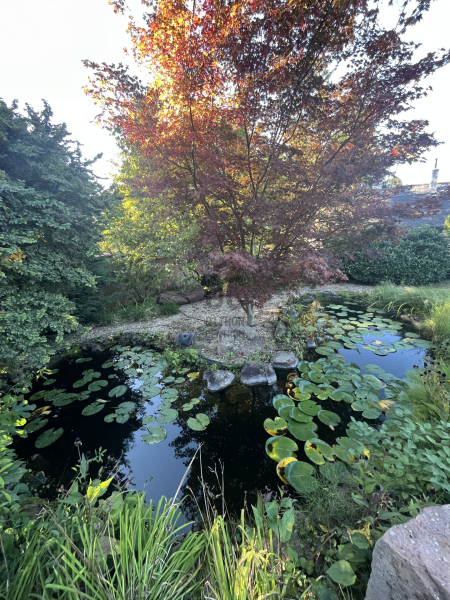 A kert hátsó részében található egy hangulatos kerti tó, amit egy vörös levelű japán juharfa tesz teljessé.