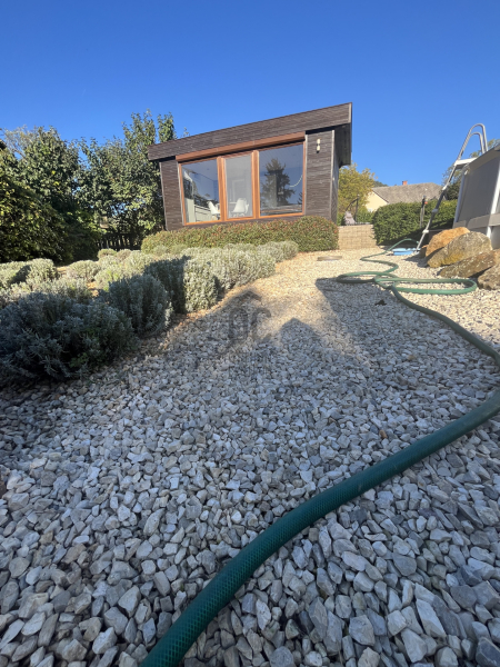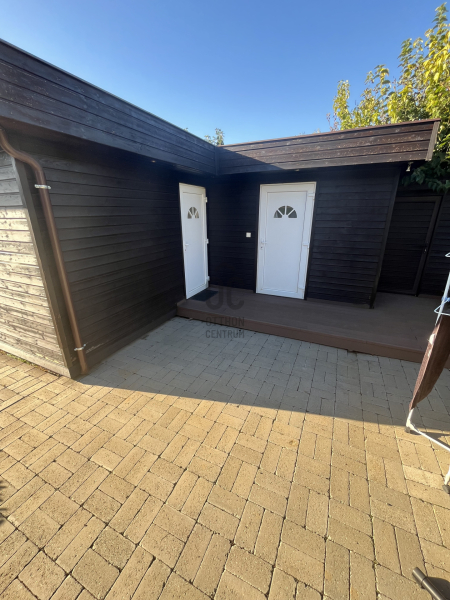 A kert szemet gyönyörködtető, az épület előtt kiépített teraszon helyett kapott egy jakuzzi, társalgásra alkalmas kiülő rész és sütögető helyiség.