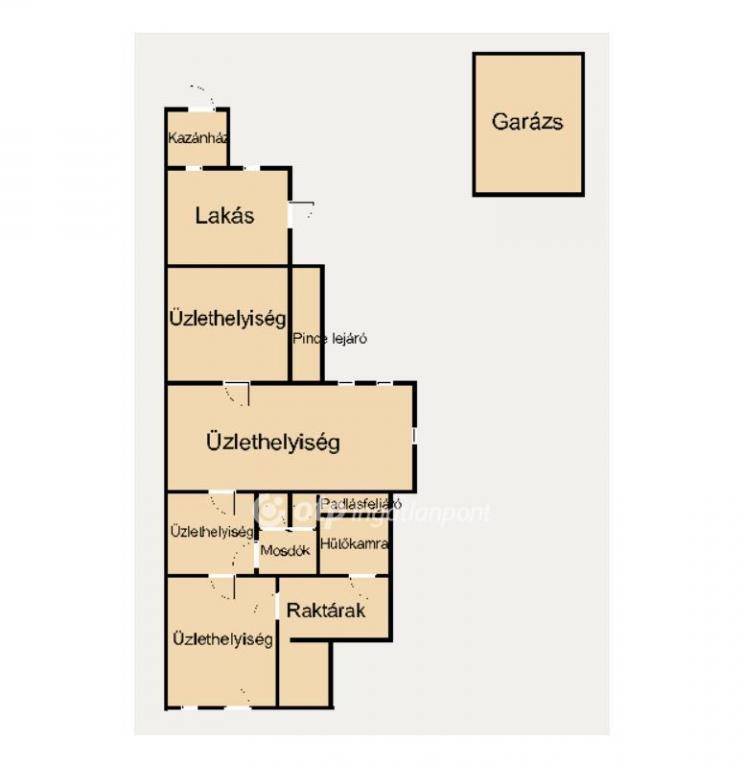Az épületben az üzlethelyiség 82, a raktárak 13 és a mosdók 8 nm-esek. A házhoz tartozik még egy 16 nm-es lakás, mely szoba, előszoba, fürdőszoba és külön WC helyiségekből áll, melyhez egy kis terasz is tartozik. Ennek folytatásában található a kazánház (4,6 nm). Az udvarban különálló garázs (23 nm) is fellelhető. Az épület mellett van egy 42 nm-es kerthelyiség is.
