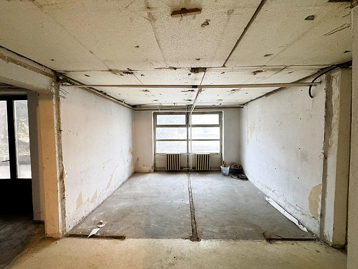 A helyiségben a bontási munkálatok már megtörténtek, így az új bérlő saját igényeinek megfelelően alakíthatja ki.