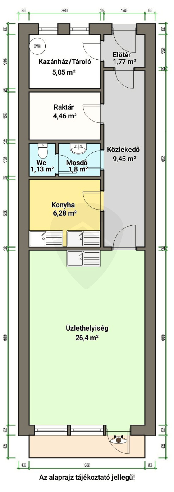 Az ingatlan nettó 57 m2-es, 2 bejárattal rendelkezik. Az eladótér egy felújított sétáló utcából közelíthető meg, a személyzet/áruszállítás pedig egy hátsó bejáraton keresztül lehetséges. Fűtéséről gázkazán gondoskodik. Nagy előnye, hogy nagy teljesítményű IPARI ÁRAMMAL rendelkezik, hiszen korábban PIZZÉRIA, RÉTESES és egyéb vendéglátói tevékenységek működtek, ezáltal számos hasonló célra is kiadható hosszútávon.