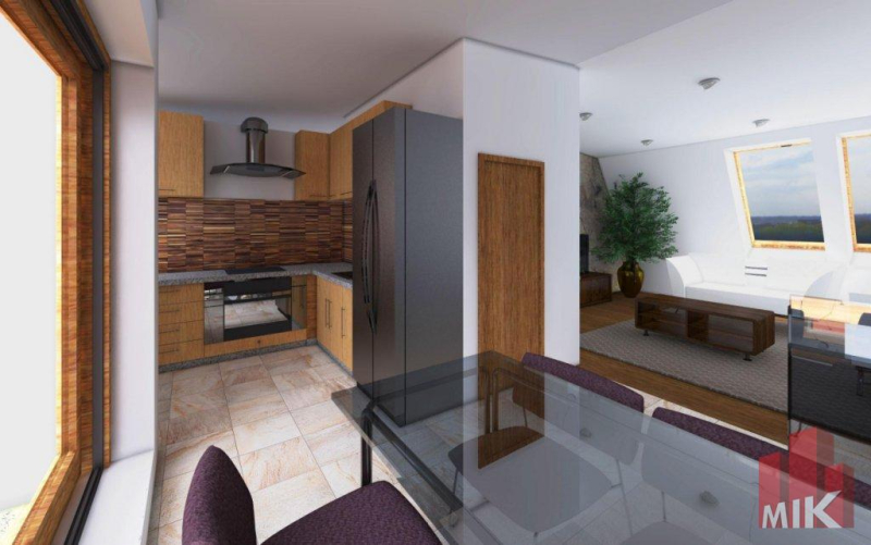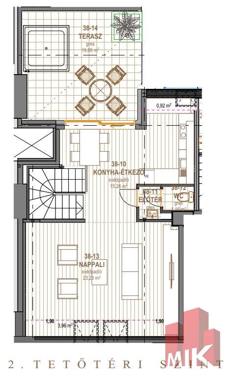 Kedvező beosztású, az alsó szinten három szoba vizesblokkokkal, a felső szinten konyha, nappali és tetőterasz található. Az alsó szinten, az előtérből és közlekedőből nyílnak az egymástól jól szeparált, közel azonos méretű szobák. A felső emeleten található a nappali és a konyha, egy vizesblokk itt is kialakításra került. A nagyméretű teraszra lehetőség van jacuzzi elhelyezésére.