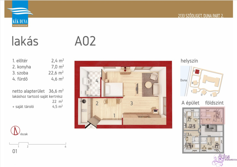 A hirdetésben feltüntetett lakás (A02) a földszinten található, Észak-Keleti fekvésű, 36,6 nm alapterületű, melyhez 11 nm-es terasz és kb. 22 nm-es saját használatú kert tartozik Az ingatlanban amerikai konyhás nappali, háló és fürdőszoba kerül kialakításra. Igény szerint a háló leválasztható.
