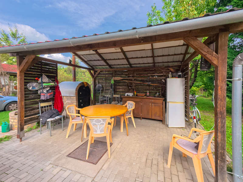 A ház két hálószobája és tágas nappali étkezője rengeteg lehetőséget kínál a pihenésre és a közös pillanatokra. Egy jól kihasználható, fúrt kút biztosítja a vízellátást, nem csak a kertben, hanem akár az egész ház számára. De természetesen van vezetékes víz a házban, így nem kell aggódni a víz miatt, akár kertészkedéshez vagy kinti játékokhoz is. Két fedett terasz várja a vendégeket: az egyik ideális reggeli kávézásokhoz és kiülős beszélgetésekhez, a másik pedig a családi és baráti összejövetelek színhelye lehet, kemencével és sütögetőhellyel, ahol a nyár minden pillanata különleges lesz.