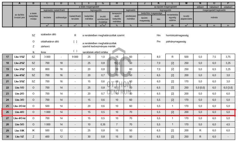 - Övezet: Lke-4/O  közepesen intenzív, oldalhatáron álló, kistelkes hegyvidéki kertvárosias lakóterület