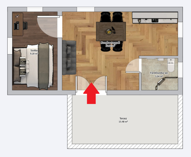 - Felosztása: 1 szoba, fürdő-wc, és egy konyha-nappali.
