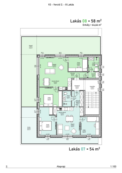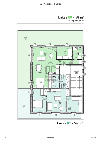 58 m² lakótér átgondolt elosztással: nappali, két hálószoba, amerikai konyhás étkező, gardrób és modern fürdő.