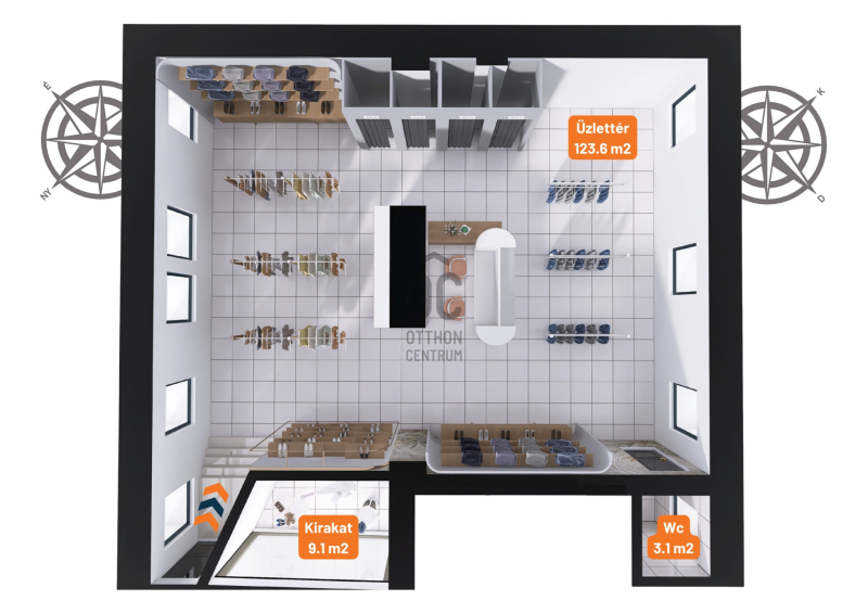 ✅ Praktikus kialakítás: a 136 m²-es tér egy tágas eladótérből áll, melyből leválasztásra került egy mosdó helyiség – így minden szükséges funkció rendelkezésre áll egy üzlet vagy iroda működtetéséhez.