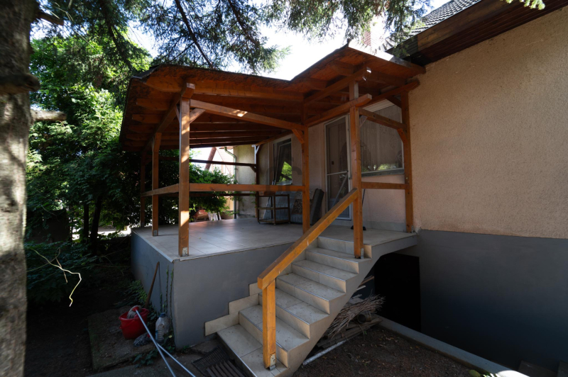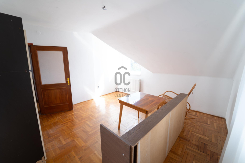 A 90-es évek elején épült, masszív szerkezetű családi ház két lakószinttel és teljesen alápincézett kialakítással rendelkezik. A pince szinten négy helyiség kapott helyet, köztük a garázs és a kazánház, ahol gáz- és vegyes tüzelésű kazán is biztosítja a fűtési lehetőségeket. Az alsó szinten a tágas előszoba után egy impozáns hall fogad, innen nyílik a 30 négyzetméteres nappali, az étkező és a konyha kamrával. Ugyanitt található egy hálószoba, egy fürdőszoba és egy külön wc is. A nappaliból egy 17 négyzetméteres fedett teraszra léphetsz ki, ahonnan a kert nyújt pihentető kilátást. Az emeletre széles falépcső vezet, ahol két nagyobb szoba került kialakításra, valamint egy kényelmes, világos fürdőszoba is szolgálja a család mindennapjait.