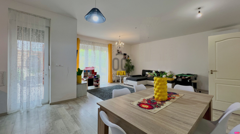 A nagyméretű nappali-étkező a konyhával egy légtérben van, így a ház asszonya is könnyedén tud kapcsolódni a család többi tagjával főzés közben is.
