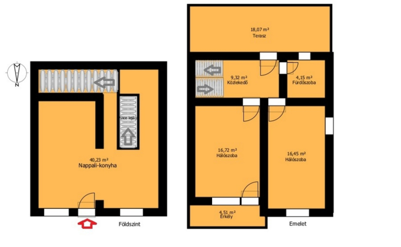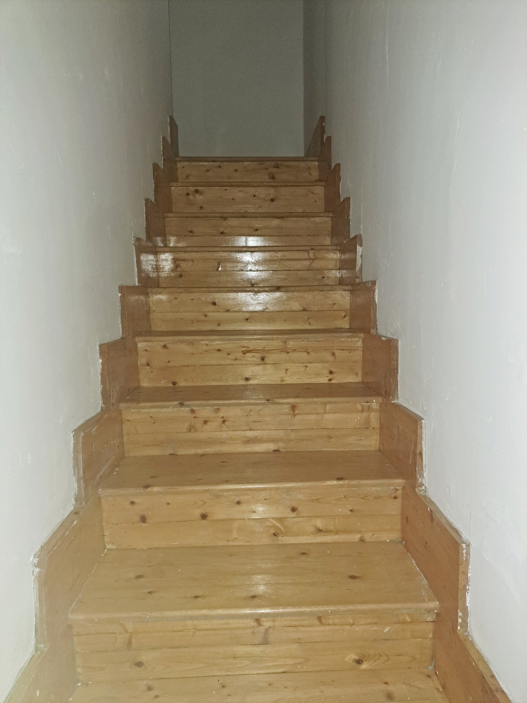 -kényelmes fa lépcső az emeletre, ahol 2 hálószoba, fürdőszoba, erkély, terasz található