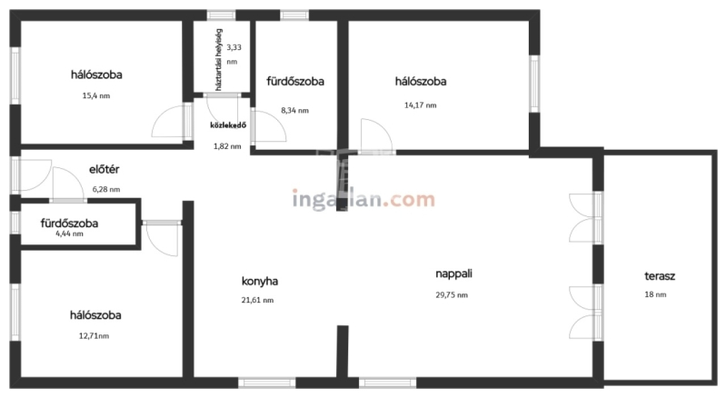 Helyiségei: Előtér 6,28 nm,konyha/étkező 21,61 nm, nappali teraszkapcsolattal 29,75 nm (fedett terasz 18,00 nm), 3 teljes értékű lakószoba egyenként 12,71 nm, 15,41 nm, 14,17 nm , fürdőszoba káddal 8,34 nm,fürdőszoba zuhanyzóval 4,44 nm, mosókonyha 3,33 nm, közlekedő 1,82 nm..