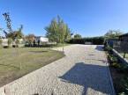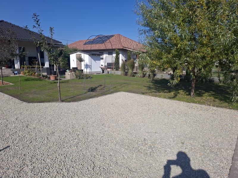 A fákkal tarkított udvarban két autó számára térkövezett beálló épült,