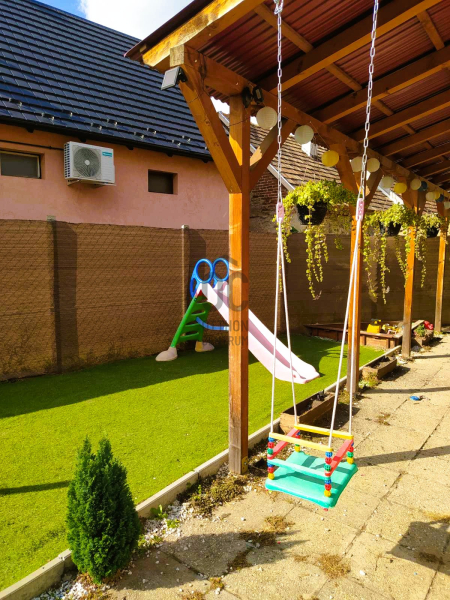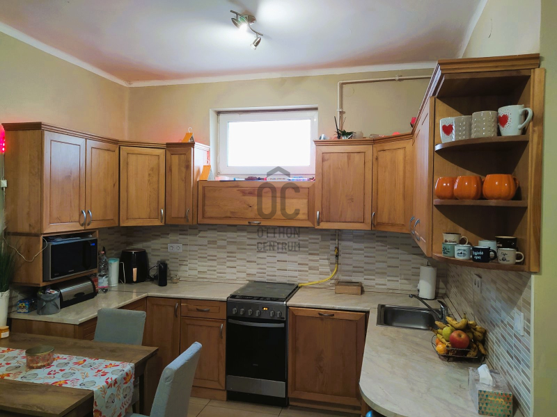 Borovi fenyőből, méretre készült a konyhabútor, beépített mosogatógéppel, gáztűzhellyel. Külön van a fürdő és a toalett.