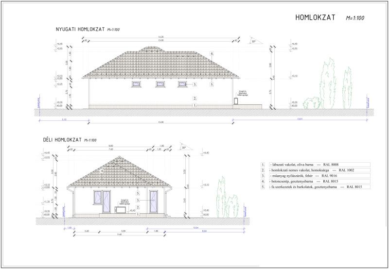 A tető héjazata antracit betoncserép lesz, a homlokzatok 15cm EPS, a padló 10cm Austrotherm AT-N100-as, a vízszintes födém 25cm Ásványgyapot szigeteléssel lesz ellátva.
