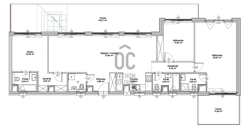A lakás belső kialakítása modern és átgondolt. Tágas, 37 m²-es nappali-étkező, három külön nyíló hálószobás, és fürdőszobás elrendezéssel. A nappaliból és hálószobákból több irányba nyíló teraszok érhetők el – összesen, közel 60 m²-en élvezhető a városra nyíló páratlan kilátás.