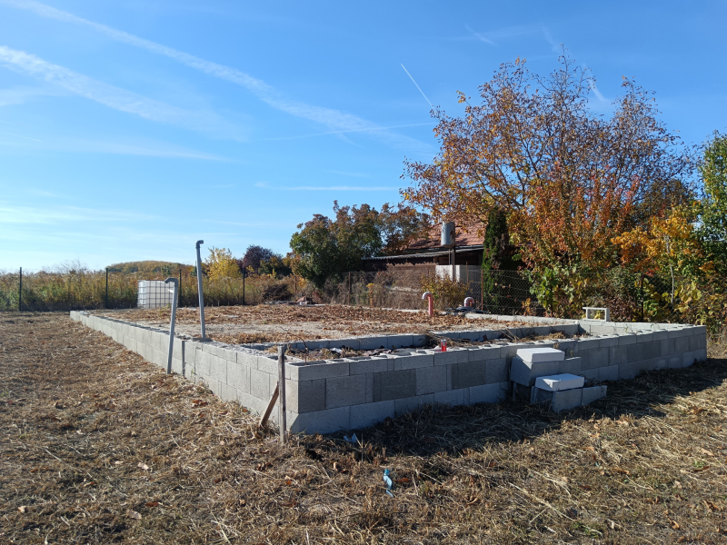 A telken egy br. 90 m2-es, nettó 66 m2-es amerikai nappali-konyhás, egy hálószobás, fürdős nyaralóház alapjai találhatóak.