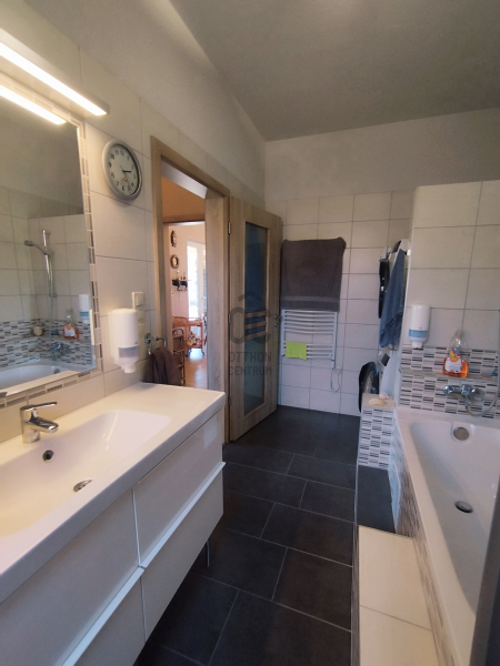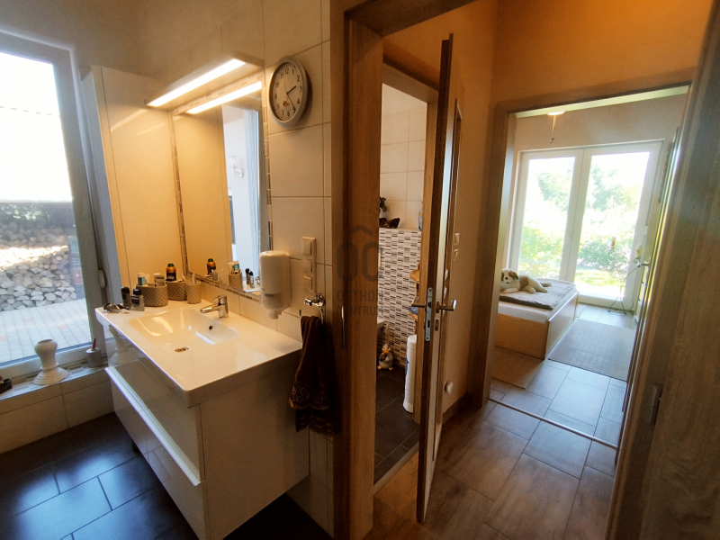 A zuhanykabinnal és káddal rendelkező fürdőszoba mellett közvetlenül egy WC helyiség kézmosóval is kialakításra került.