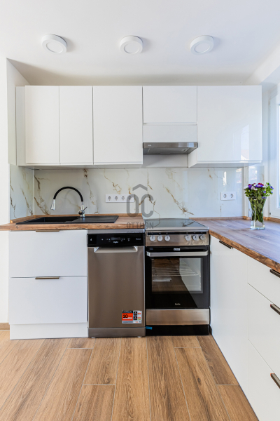 A konyhában új beépített bútorok mellett első osztályú tűzhely , mosogatógép lett beépítve.