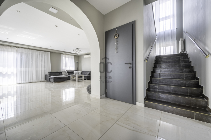 Az ingatlant tágas és világos terek jellemzik, az alsó szinten levő nappali bárpulttal, és a földszinten levő nappali, egyaránt 60-60 m2, és déli fekvésűek. Minden szinten, beépített hatalmas tükrös szekrények. Fedett gépkocsi tároló, 3 autó részére. A közeli Halmi erdőbe, mely 5 perc kényelmes sétára található, kiváló sportolásra és kikapcsolódásra, ad lehetőséget.