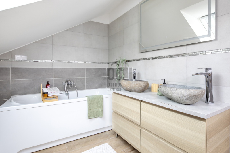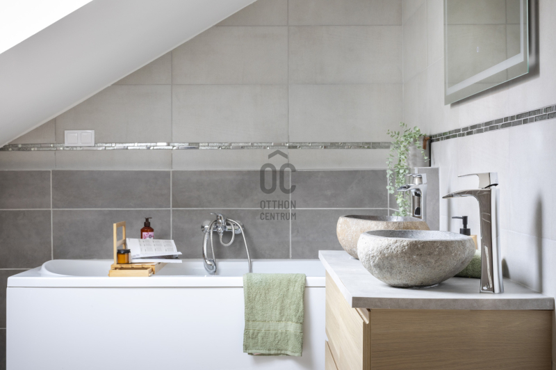 Az emeleten fűrdőkádas dupla mosdószekrény kényelmes a mindennapokban. Hangulata fantasztikus....