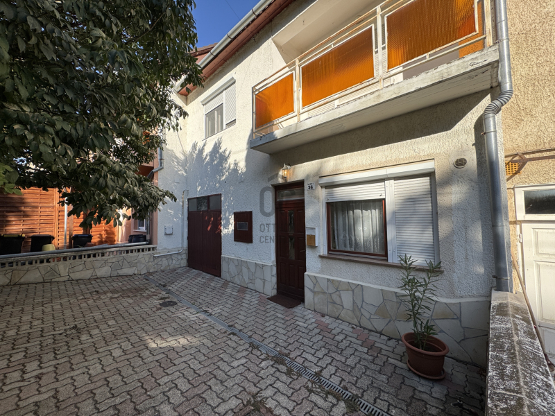 Ezen kívül a ház felújítandó állapotban van. Külseje nagyon megnyerő, 3 lakószinttel rendelkezik a tájékoztató jellegű alaprajzon látható elosztásban. A Szekszárdon megszokott sorházaktól megkülönbözteti az első emeleti tetőterasza és \\\"kivett lakóház, udvar\\\"-ként való bejegyzése, ami nem gördít akadályt a hitelfelvétel útjába. Az alagsorból elérhető egy hátsó kert rész, ahol füvesített udvar és kis lankás részen szőlő található.