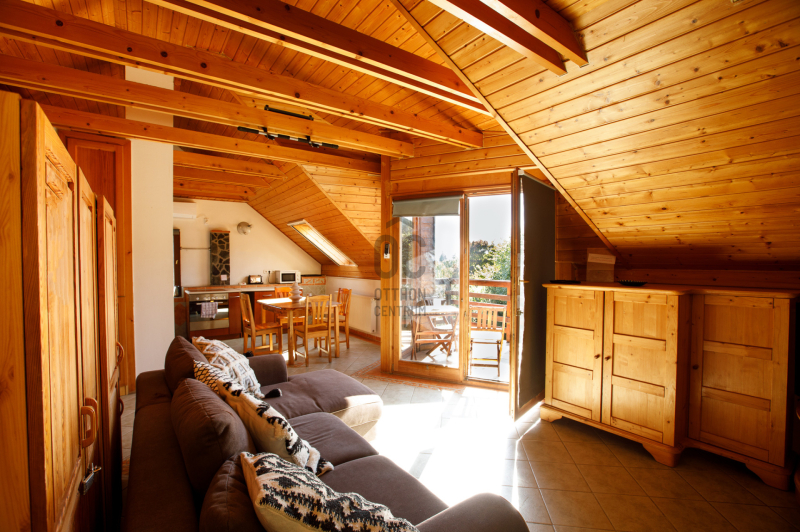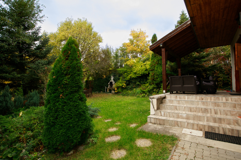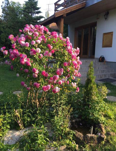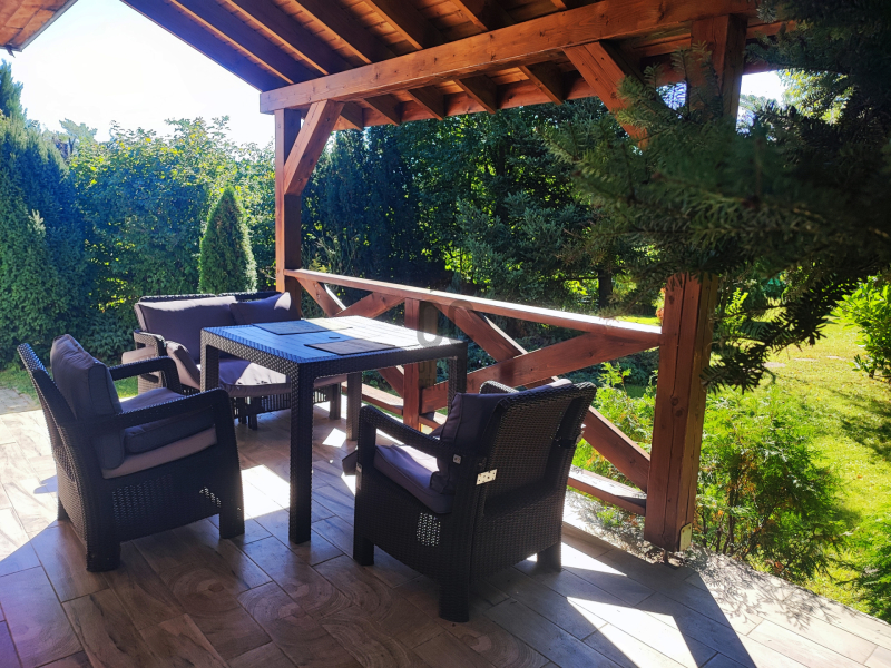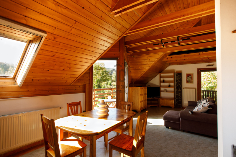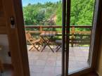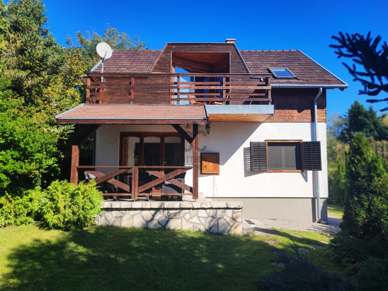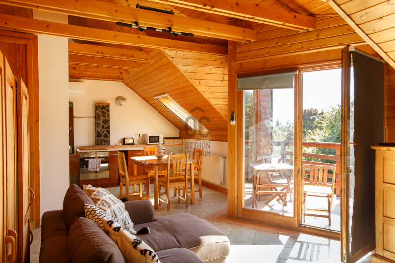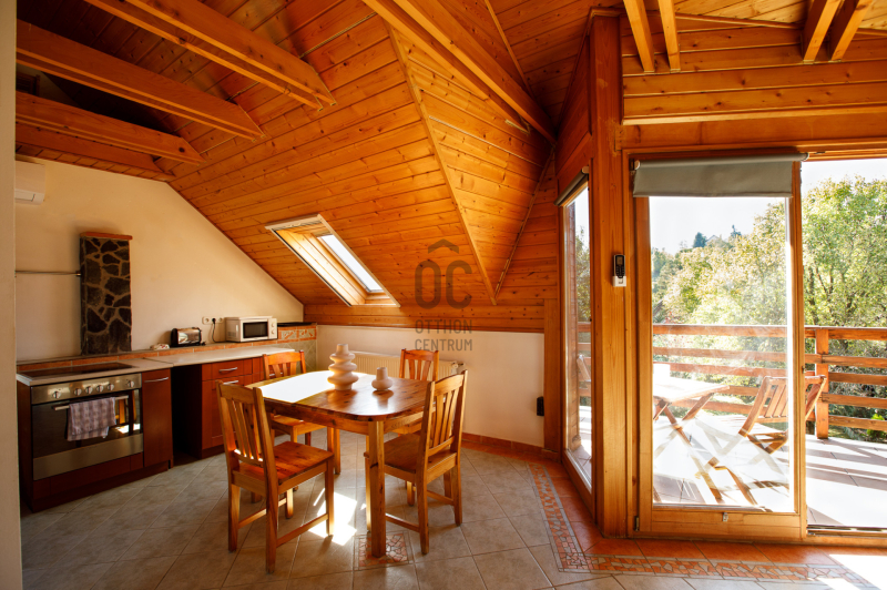 A nappaliból erkély nyílik, ahonnan csodás kilátás tárul a környező erdőkre, dombokra és a gondozott kertre.