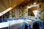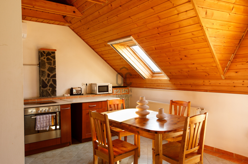 A felső szint teljesen elkülönül az alsótól, külső lépcsőn közelíthető meg, így önálló lakrészként is használható. Itt egy hangulatos, egy légterű stúdiólakás található nappali–étkező–konyha elrendezéssel, saját fürdőszobával és WC-vel, valamint egy kis tárolóval.