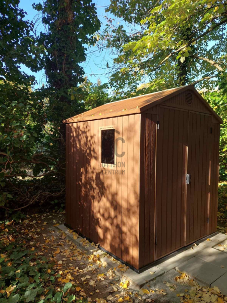A ház mögött egy fa hatású műanyag tároló ad helyet a kerti szerszámoknak, strandfelszereléseknek és egyéb letárolandó dolgoknal.