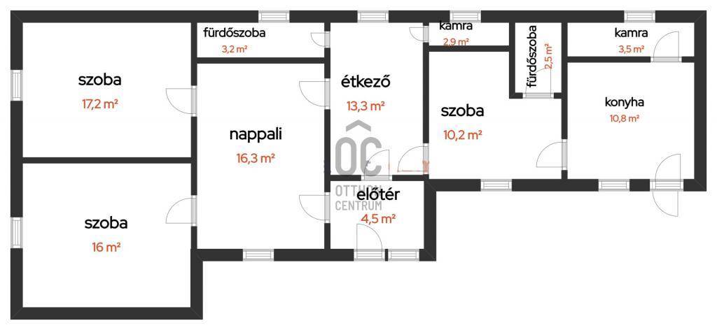 A bruttó 120 m² hasznos alapterülettel rendelkező házban három szoba, egy tágas 16.3 m² nappali, további fürdőszoba, kettő konyha, kamra, étkező, és egy előtér került kialakításra.