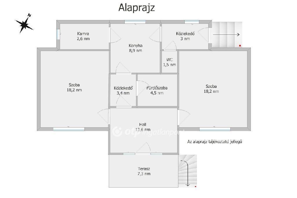 külső lépcsővel megközelíthető tetőtér (beépíthető, bővítési lehetőség).