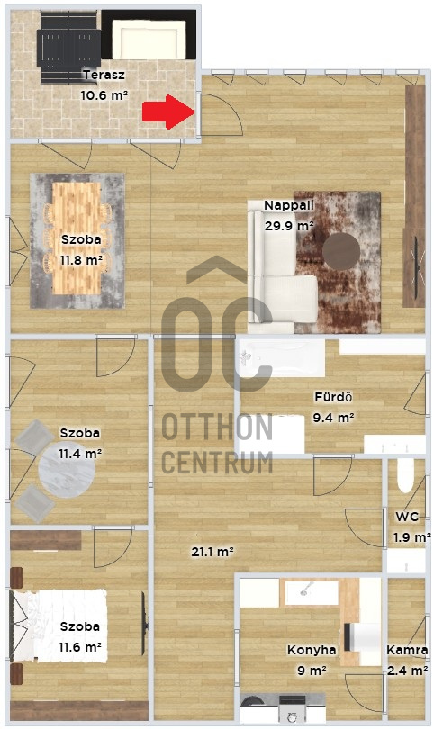 A tágas nappali világos, barátságos légkört biztosít, míg a 28 négyzetméteres terasz ideális helyszín a pihenésre és a szabadidő eltöltésére.