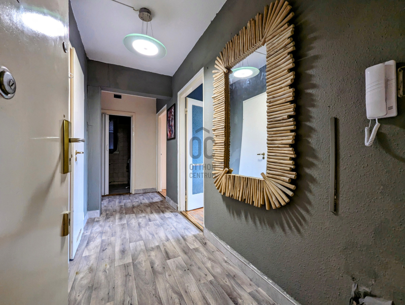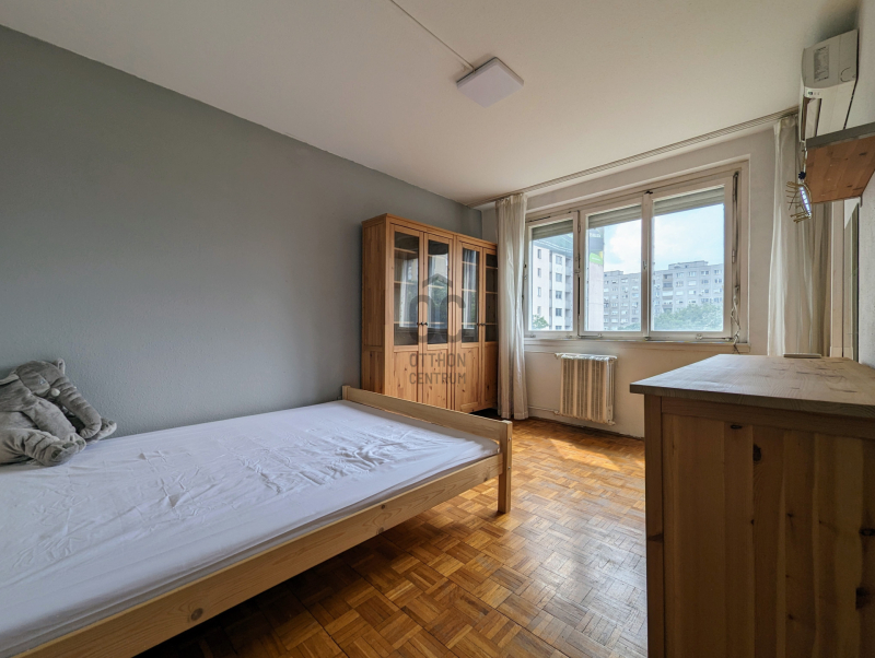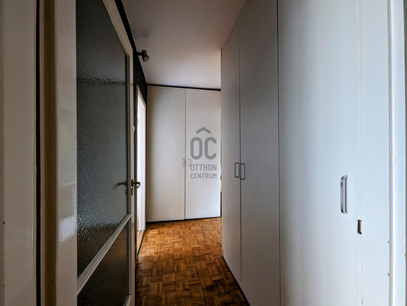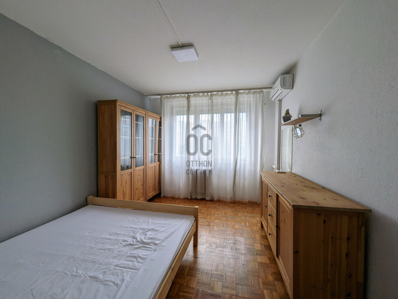66 nm-es, 4. emeleti, kiváló elosztású, világos, tágas lakás. Nappali loggiaval, két hálószoba, fürdőszoba, wc, ablakos konyha kamrával, plusz egy gardrób helyiség, található a lakásban. Az összes helyiség külön, az előszobából, közlekedőből megközelíthető. A lakás bútorozott. Távfűtés biztosítja a meleget a lakásban, klíma berendezés pedig a hűtését. A szobákban parketta, a többi helyiségben pedig járólap található.
