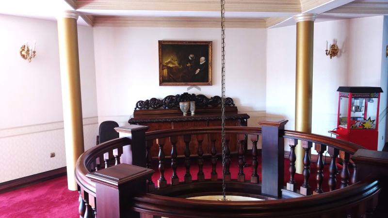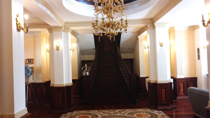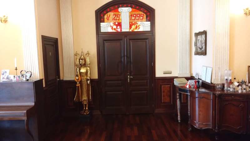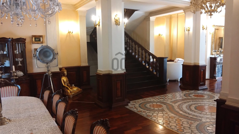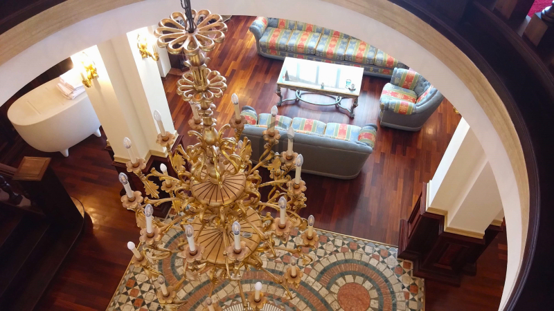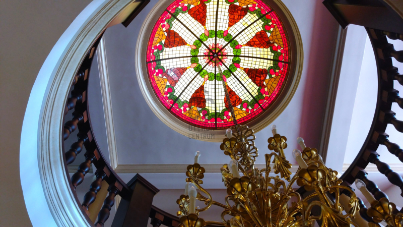A házba belépve egy impozáns, 120 nm-es nappaliba érkezünk, ahol a padlón egy 14 nm-es római mozaikot, a fejünk fölött pedig egy gyönyörű ólomüveg kupolát láthatunk.