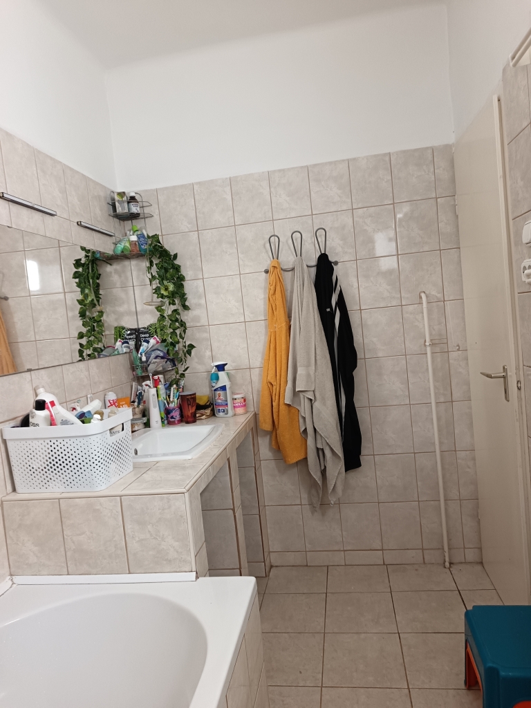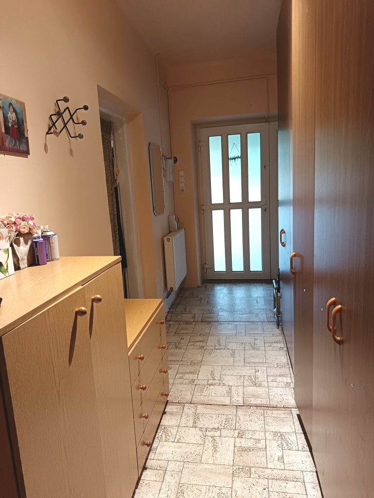 A 10 nm nagyságú fedett teraszon át haladunk az előszobába, ahonnan nyílik a konyha, a fürdőszoba, és a 3 szoba.