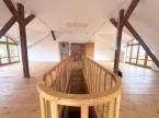 A tetőtér szintén fa mennyezettel és látszógerendákkal készült, mely meleg, otthonos hangulatot áraszt, és rengeteg lehetőséget kínál kreatív belsőépítészeti megoldásokra.