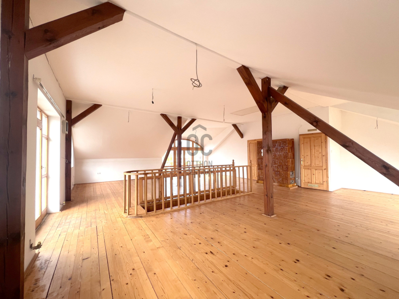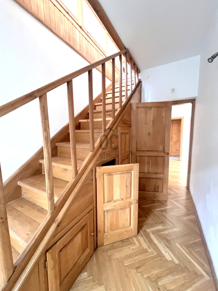 A földszinti helyiségekben a nagy belmagasság és a fa részletek különleges térérzetet teremtenek, ami ritkaság a környéken.