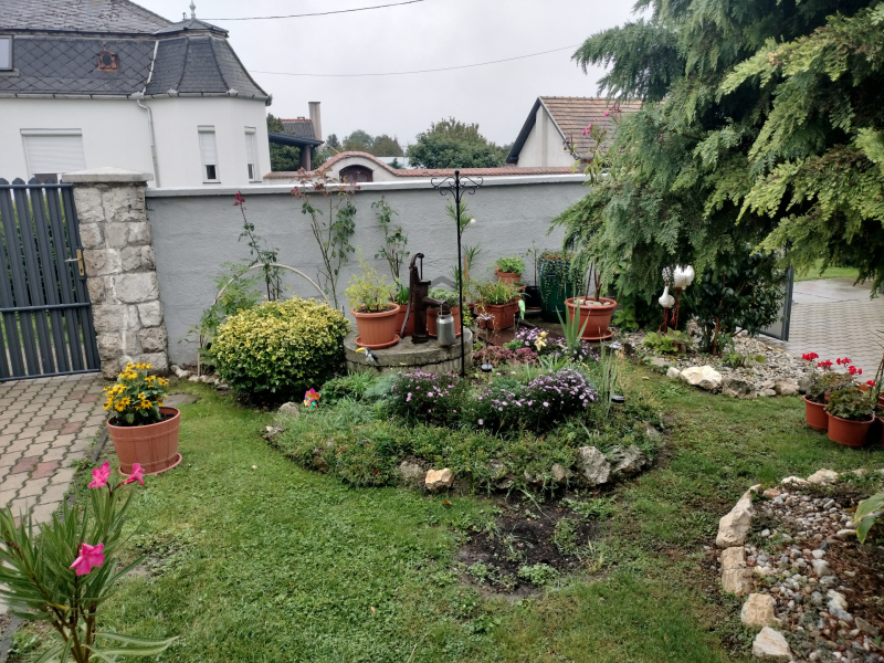 A nagy méretű terasz alatt pince található. Az udvar rendezett, parkosított és térkövezett, ahol kis játszótér, sziklakert és kút is helyet kapott.