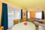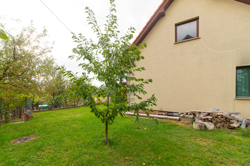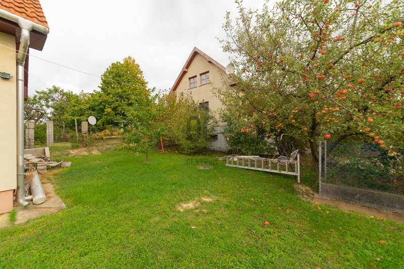 A kertben a szépen termő gyümölcsfák és a zöld növényzet gondoskodnak a nyugalomról – egy kis oázis, ahol jó megpihenni a nap végén.