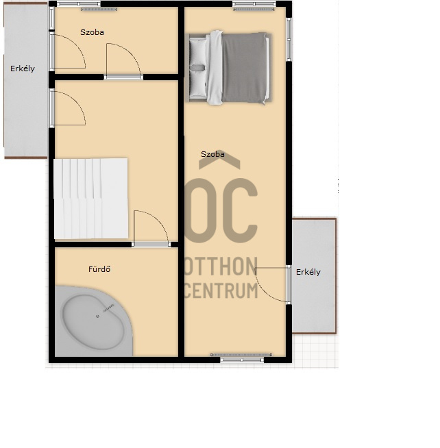 Az emeleten jelenleg két hálószoba és egy nagy méretű fürdőszoba van, de könnyedén kialakítható még egy félszoba is.