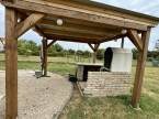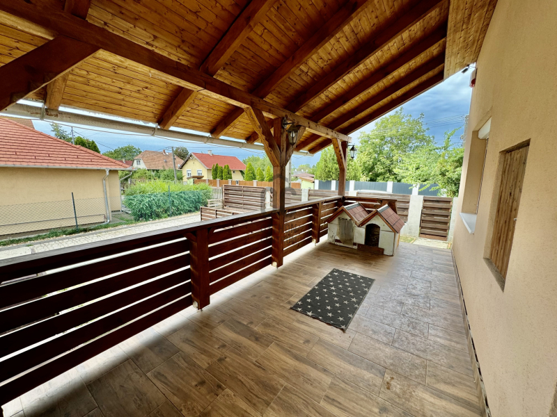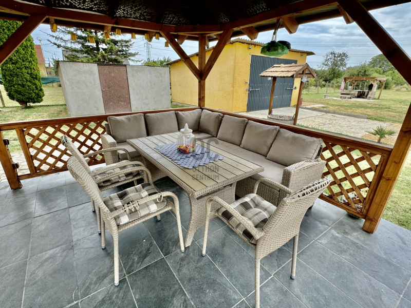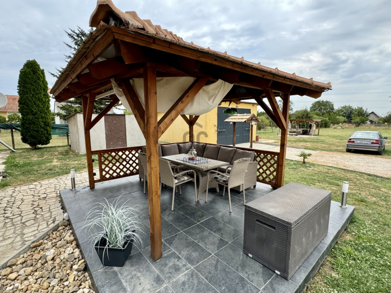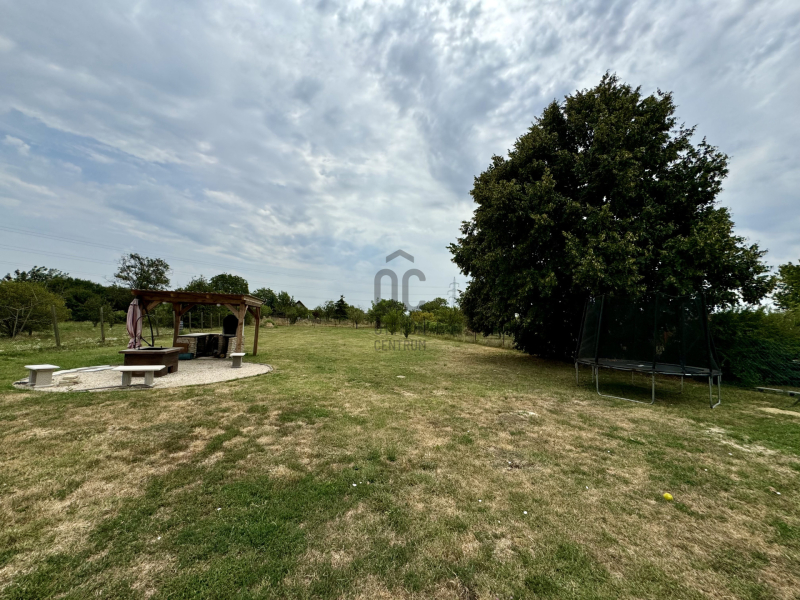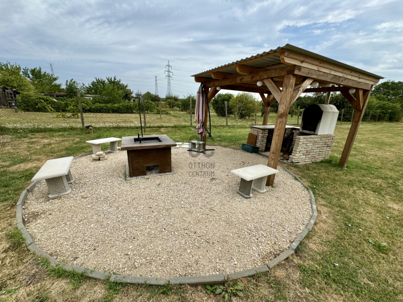 - tároló, 2 beállásos garázs szerelőaknával, fedett terasz, fedett sütögető-bográcsozó és egy óriás telek lehetőségekkel