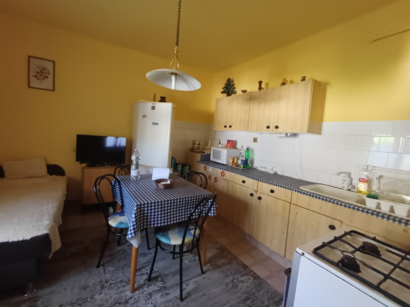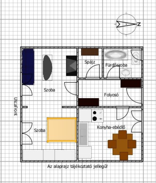 Az ingatlan elrendezése praktikus: konyha-ebédlő, spájz, fürdőszoba, folyosó, valamint egy összenyitott nappali-hálószoba, amely igény esetén két külön szobává is alakítható.