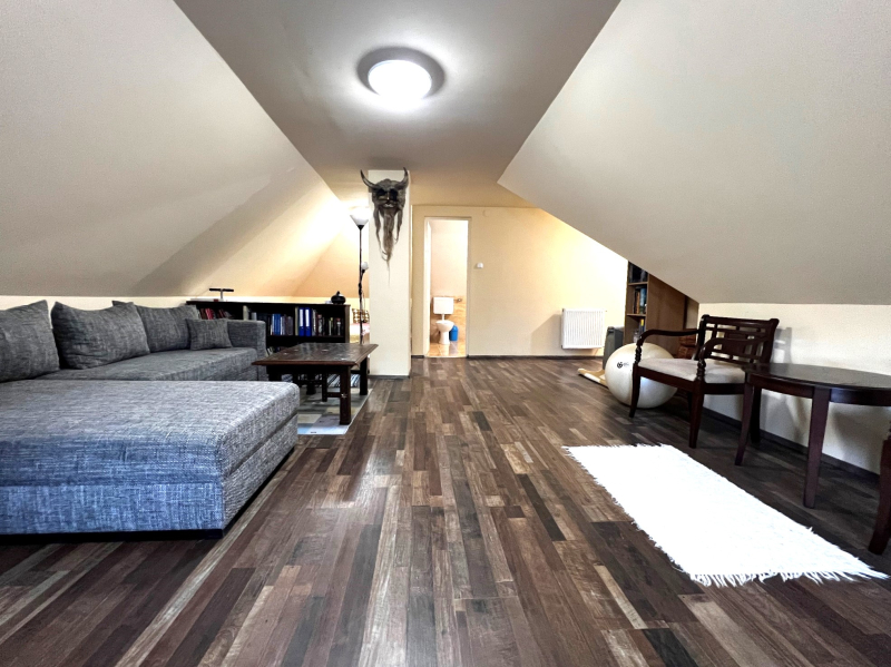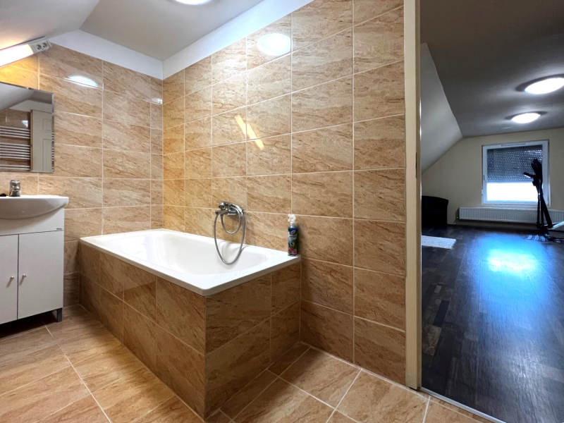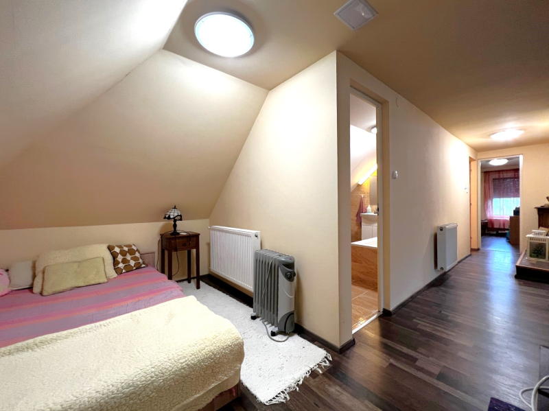 Az emeleten található egy különnyíló hálószoba, tágas nappali, hálórész, kádas fürdőszoba wc-vel.