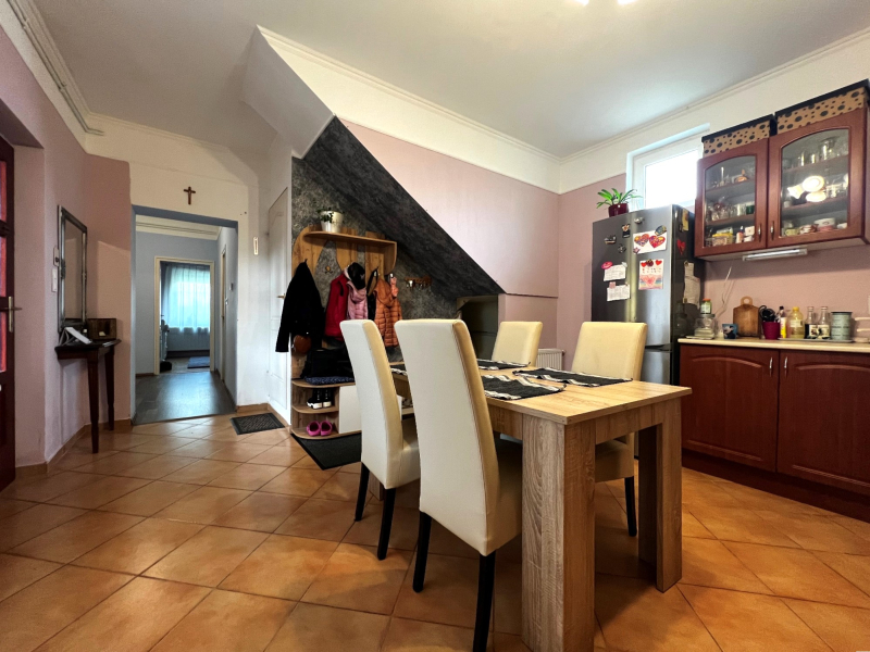 A házba lépve a tágas konyha étkezőbe jutunk ahol a kamra is megtalálható, tovább haladva az emeleti lépcsőház található.