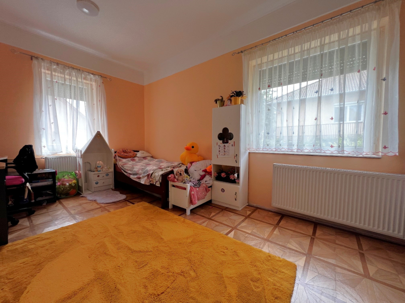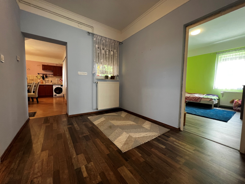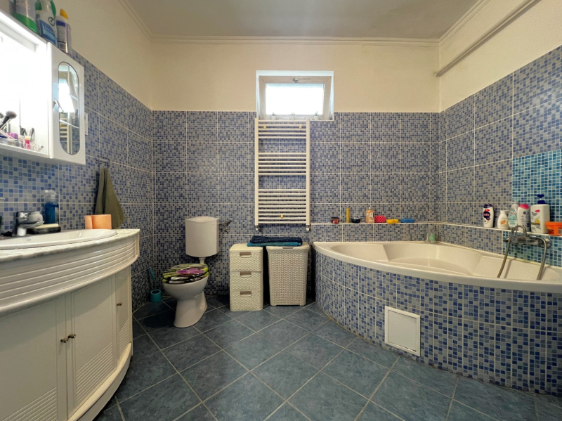 A földszinti közlekedőn át juthatunk el a 3 különnyíló szobába és a 9 nm-es fürdőszobába, ahol a sarokkád, zuhany és wc is megtalálható.