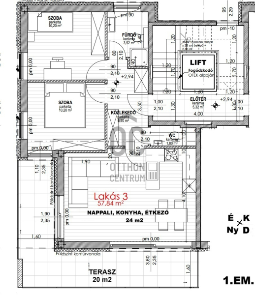 1.E.: 2 db 68 m2-es (20 m2 terasz 1/2 méretének a beszámítása mellett. A terasz nélküli nettó alapterület 58 m2), DNY-i, 3 szobás, 2 db teremgarázs hely (+10 Mft/db), és 4,5 m2 tárolóval (+4,5 Mft)
