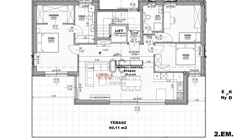 2.E. PENTHOUSE: 131 m2-es (60 m2 terasz 1/2 méretének a beszámítása mellett. A terasz nélküli nettó alapterület 101 m2), 4 szobás, 2 fürdőszobás, 2 db teremgarázs hellyel (+10 Mft/db), és 5,5 m2 tárolóval (+5,5 Mft)