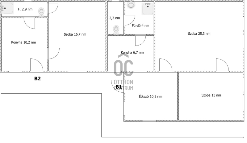 -az első részben két szoba, étkező, konyha és fürdő található ( ~ 65 nm)