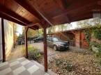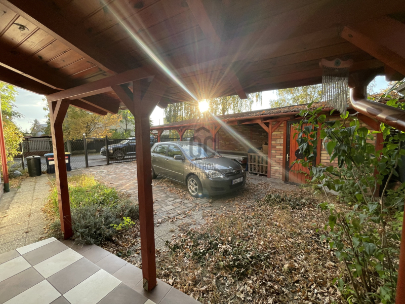A gondozott udvarban található egy fedett gépkocsibeálló, valamint egy kb. 5 m²-es, zárható kerti tároló, ami praktikus helyet biztosít szerszámoknak, kerékpárnak vagy egyéb eszközöknek.